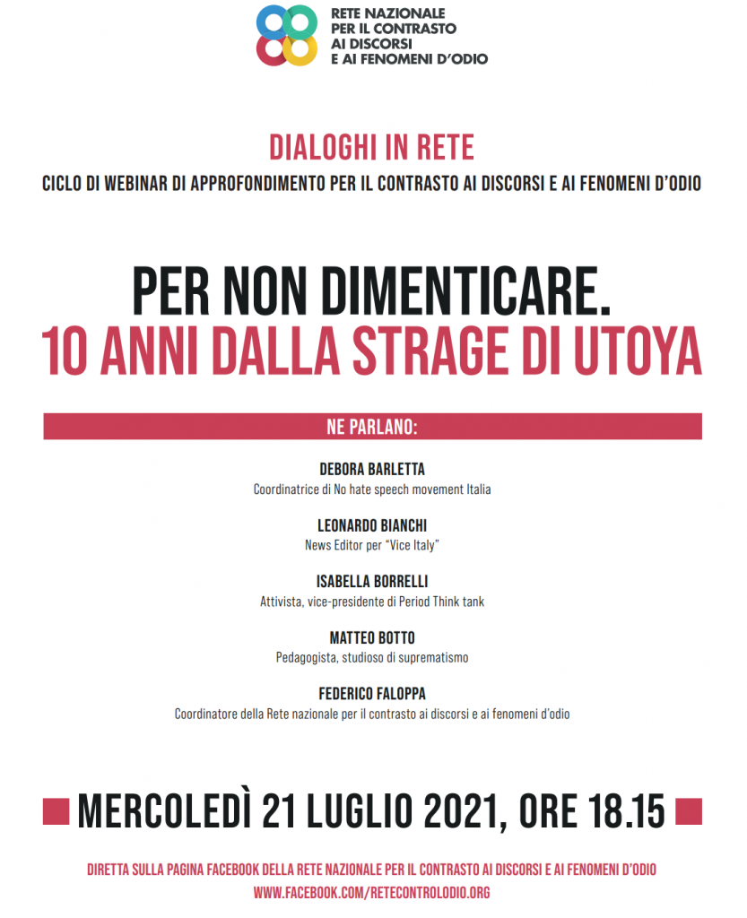 Per non dimenticare ciò che successe a Utoya dieci anni fa. E per non dimenticare, con Utoya, fino a che punto può arrivare il crimine d’odio.