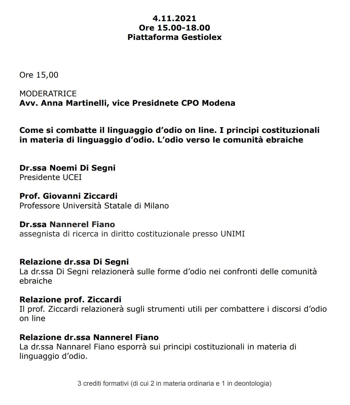 E’ iniziato il 21 ottobre il ciclo di quattro incontri sul linguaggio d’odio organizzato dall’Ordine Degli Avvocati Di Modena in collaborazione e con il patrocinio della Rete nazionale per il contrasto ai discorsi e ai fenomeni d’odio.