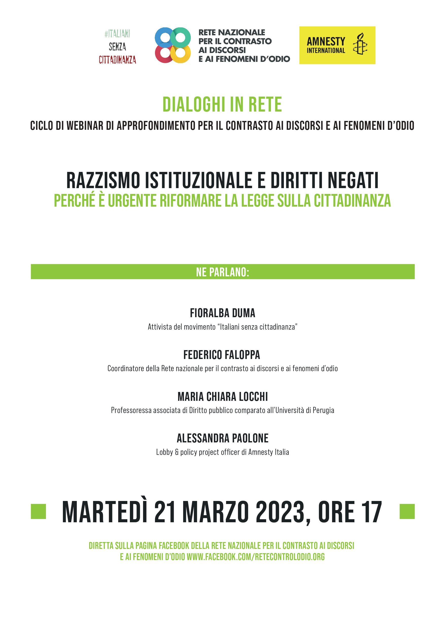 Riparte il ciclo di webinar Dialoghi in Rete della Rete nazionale per il contrasto ai discorsi e ai fenomeni d’odio, con il primo webinar dal titolo Razzismo istituzionale e diritti negati. Perché è urgente riformare la legge sulla cittadinanza.