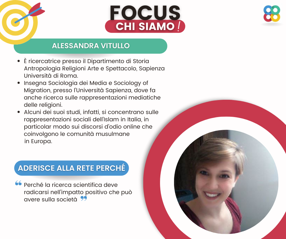 Alessandra Vitullo è ricercatrice e docente presso la Sapienza Università di Roma dove insegna Sociologia della comunicazione e Sociologia della migrazione. È responsabile scientifica del Laboratorio Religioni e Mutamento Sociale presso il dipartimento SARAS dell’Università Sapienza e co-direttrice del Network for New Media, Religion and Digital Cultures, presso la Texas A&M University. È stata ricercatrice e visiting scholar presso diverse università e centri di ricerca quali l’Università degli Studi di Milano “Bicocca”, la Fondazione Bruno Kessler a Trento, la Texas A&M University, Uppsala University e la KU Leuven. Oltre al suo impegno accademico Alessandra è stata educatrice presso una comunità di minori stranieri non accompagnati, insegnato nelle scuole superiori, e lavorato come giornalista freelance, realizzando reportage in aree di crisi come in Kosovo, o in Palestina.