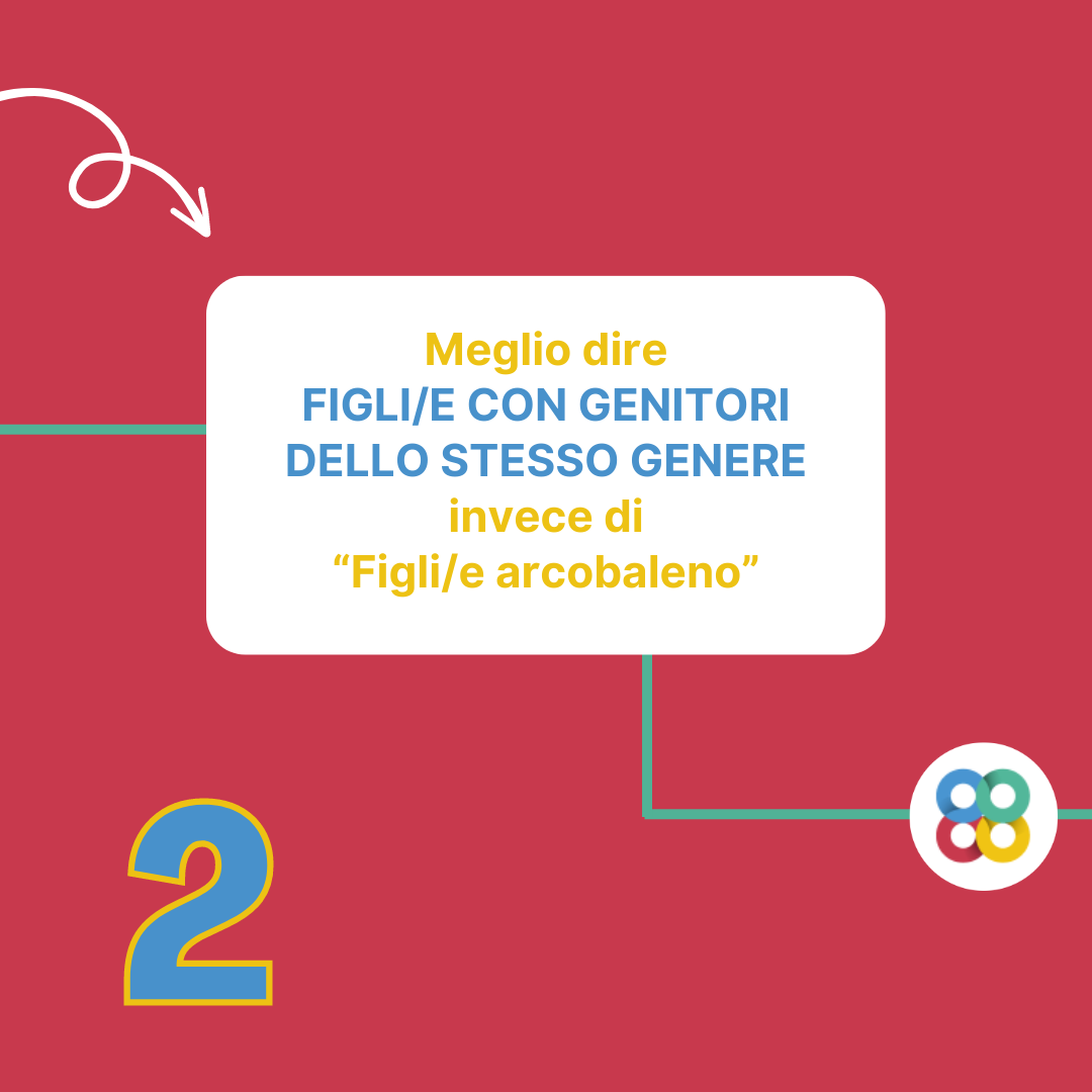 “Famiglia/famiglie arcobaleno” richiama il nome di una specifica associazione in Italia (“Famiglie Arcobaleno”) che, pur essendo l’associazione più importante tra quelle che si occupano di omogenitorialità, non rappresenta tutte le famiglie omogenitoriali. Inoltre, l’immagine che richiama il termine “arcobaleno” rischia di non dare la giusta importanza – né il giusto spessore – ai problemi che devono affrontare le famiglie omogenitoriali, e le persone che ne fanno parte, che non vedono riconosciuti i loro diritti e che quindi vengono discriminate.