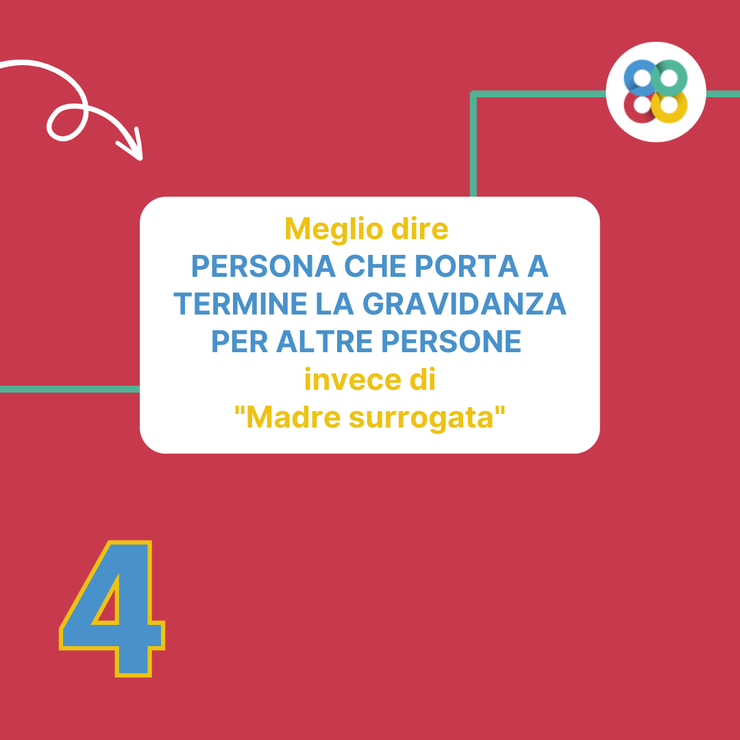 Anche l’espressione “surrogazione di maternità” può essere fortemente connotata in negativo: “surrogata” è termine che indica una sostituta di qualità inferiore. Pare quindi più corretto il termine “persona che porta a termine la gravidanza” o “persona che porta a termine la gravidanza per altre persone”.
