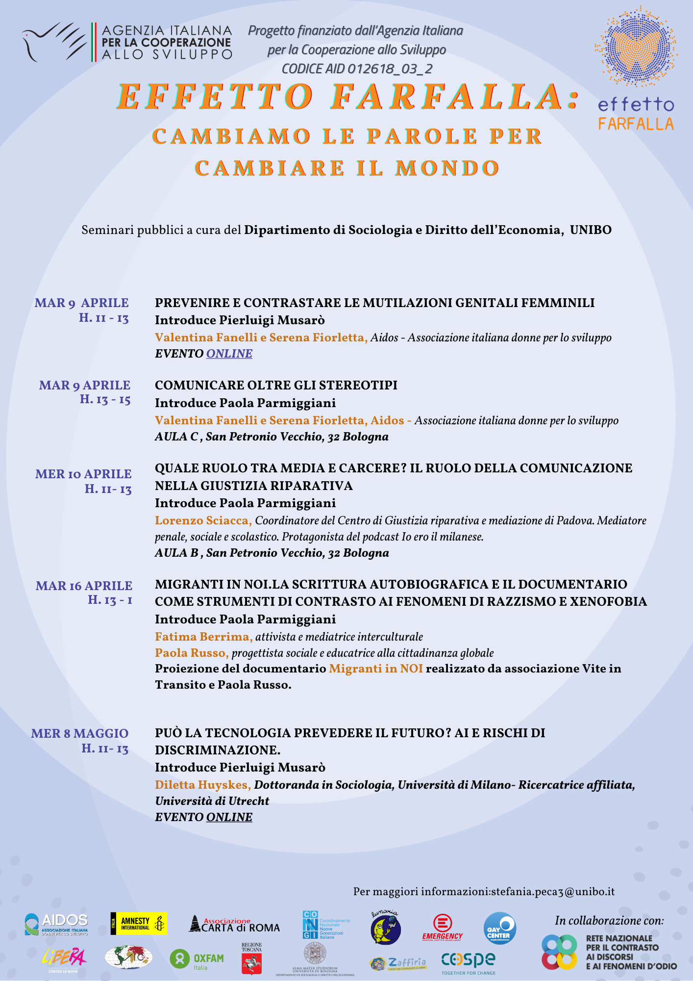 Il progetto Effetto Farfalla, infatti, vuole sensibilizzare e rafforzare comportamenti positivi nelle persone affinchè si possano contrastare le discriminazioni e promuovere il rispetto di tutte le diversità. Solo attraverso la consolidazione di conoscenze, pensiero critico ed empatia, si può iniziare a costruire una società sempre più accogliente e che sappia depotenziare i fenomeni d’odio. Per questo motivo, i seminari sono aperti a tutta la comunità a partire dalle persone giovani, tra gli 11 e 19 anni, e le persone adulte.