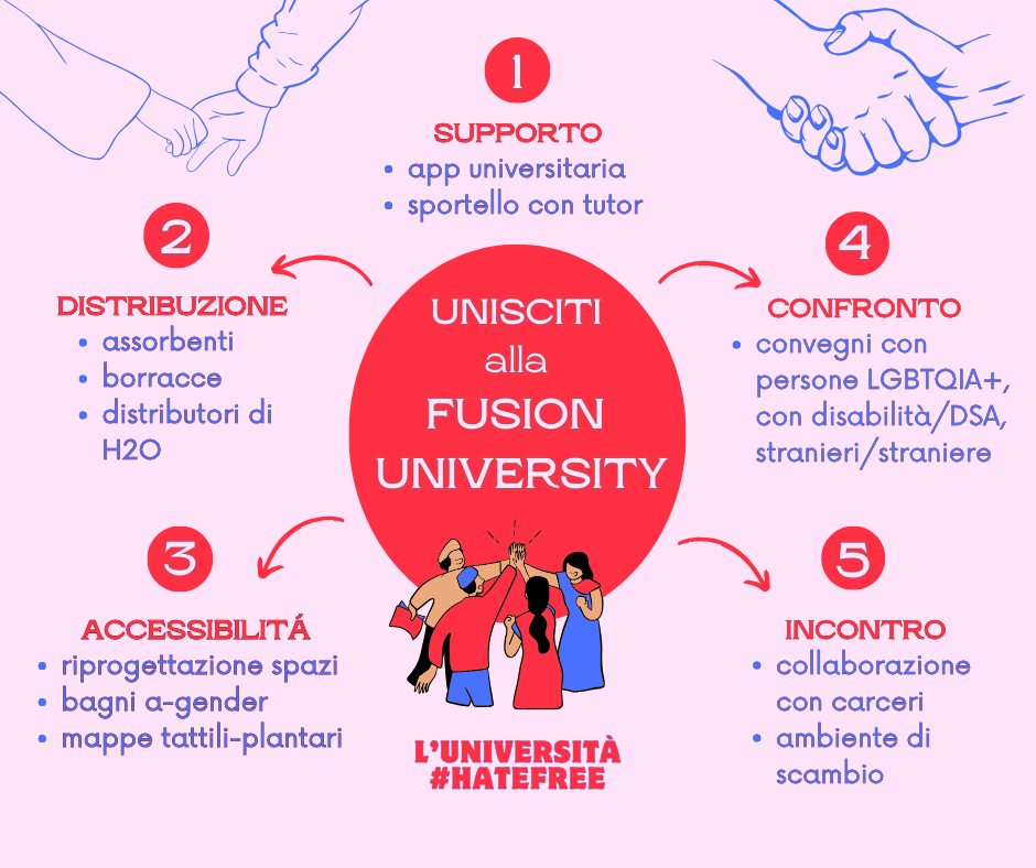 La Fusion University pensata da Anna Stano, Elena Ciccimarra e Alessio Bernardi vuole impegnarsi attivamente nella realizzazione di un’università #HATEFREE fondandola su 5 pilastri principali: