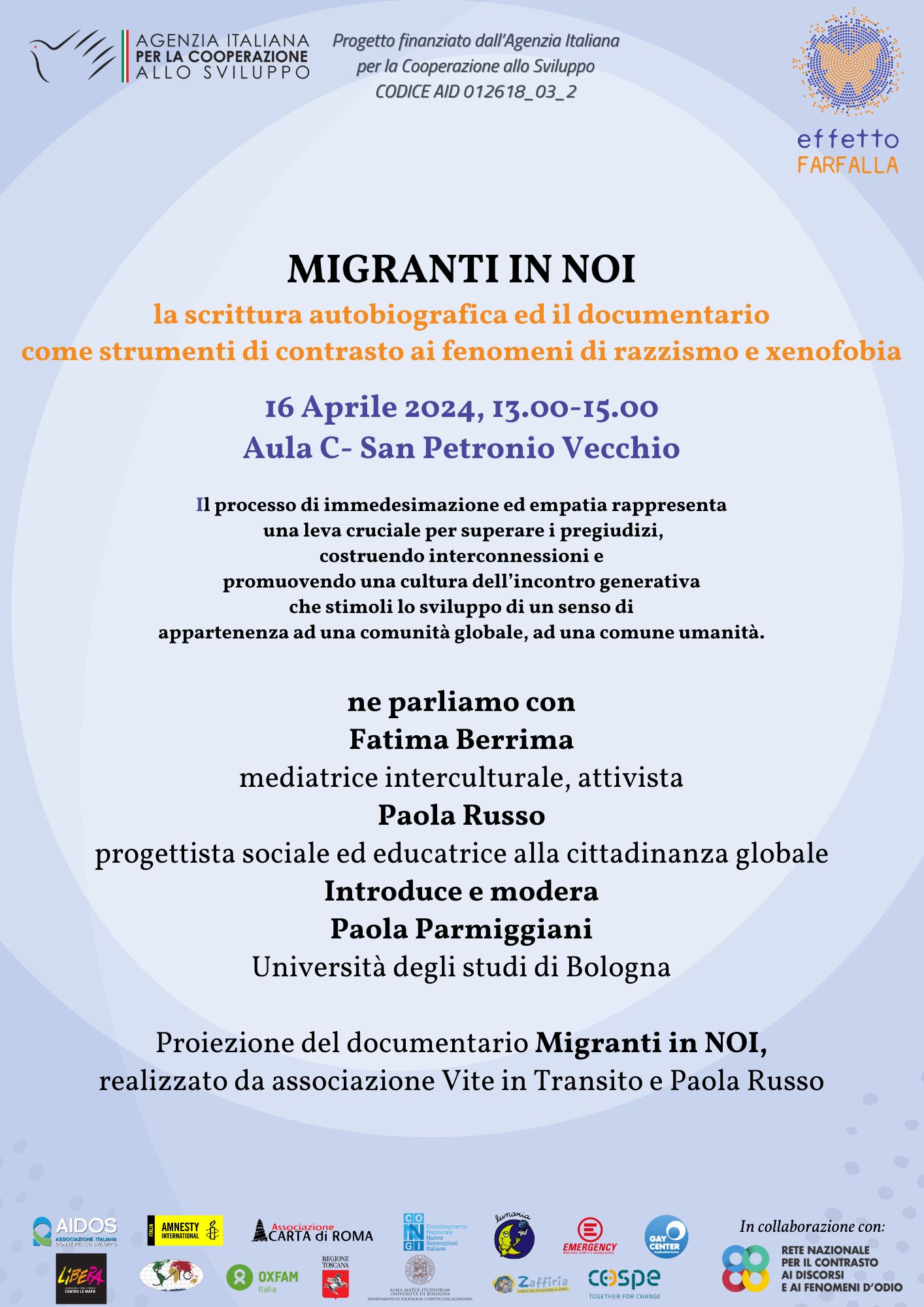 Durante il seminario verrà proiettato il documentario Migranti in NOI realizzato dall’associazione Vite in Transito e discusso insieme alla moderazione dalla prof.ssa Paola Parmiggiani (Università di Bologna) e le ospiti Fatima Berrima, mediatrice interculturale e attivista, e Paola Russo, progettista sociale ed educatrice alla cittadinanza globale che ha ideato e realizzato il documentario.