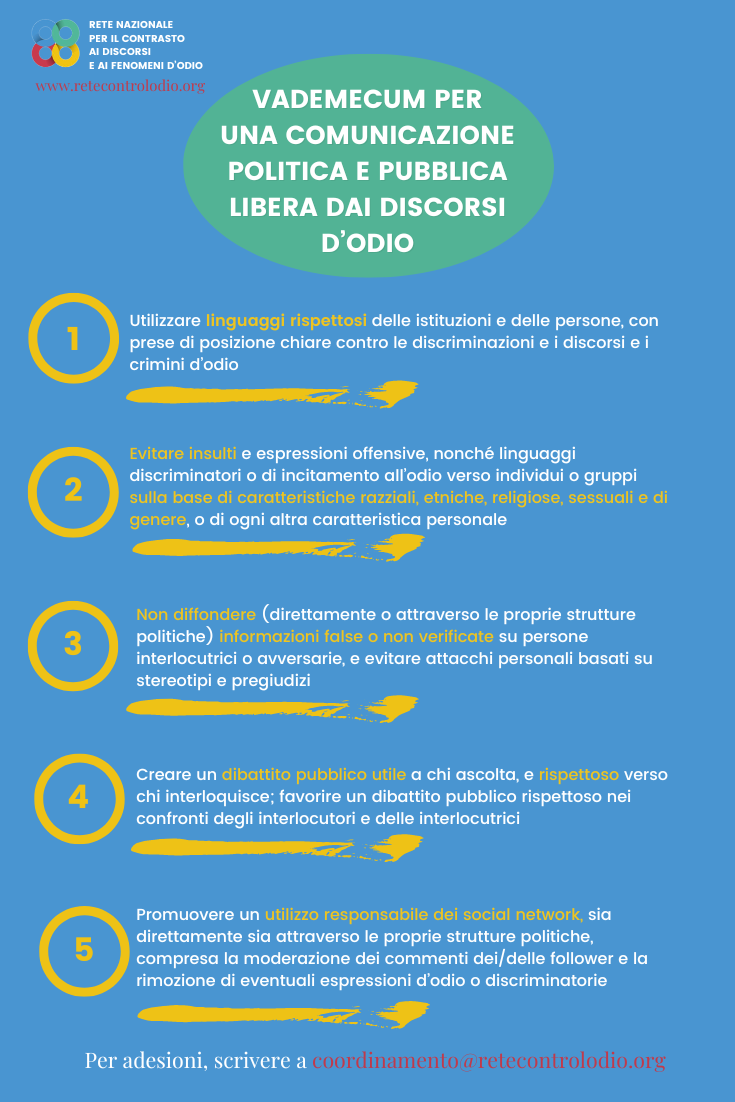 Un vademecum in cinque punti per una comunicazione politica libera dai discorsi d’odio, a tutela dei diritti umani e dei valori democratici. Un invito a un dibattito pubblico rispettoso e responsabile, in linea con gli sforzi europei per la sicurezza e l’equità dei processi elettorali.