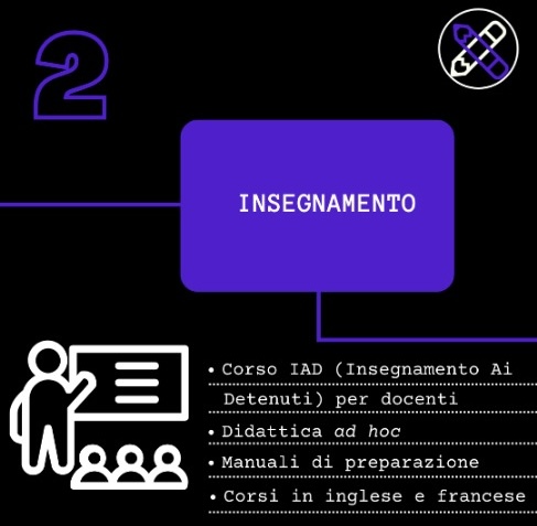 Il Vademecum propone come primo obiettivo di istituire il Polo Universitario Penitenziario, recuperando edifici dismessi, rendendoli sicuri e sorvegliati. Un’opera di questo tipo ha come vantaggio l’uscita dal carcere e l’avere contatti con la realtà esterna, il che può incrementare il benessere psicologico del detenuto. Gli insegnanti sono tenuti a frequentare il corso di formazione IAD (Insegnamento Ai Detenuti) che consiste in 200 ore retribuite frequentabili online. Uno dei contenuti del corso è l’importanza di una didattica creata ad hoc in base ai tempi di apprendimento, orari e impegni quotidiani di ciascun detenuto.